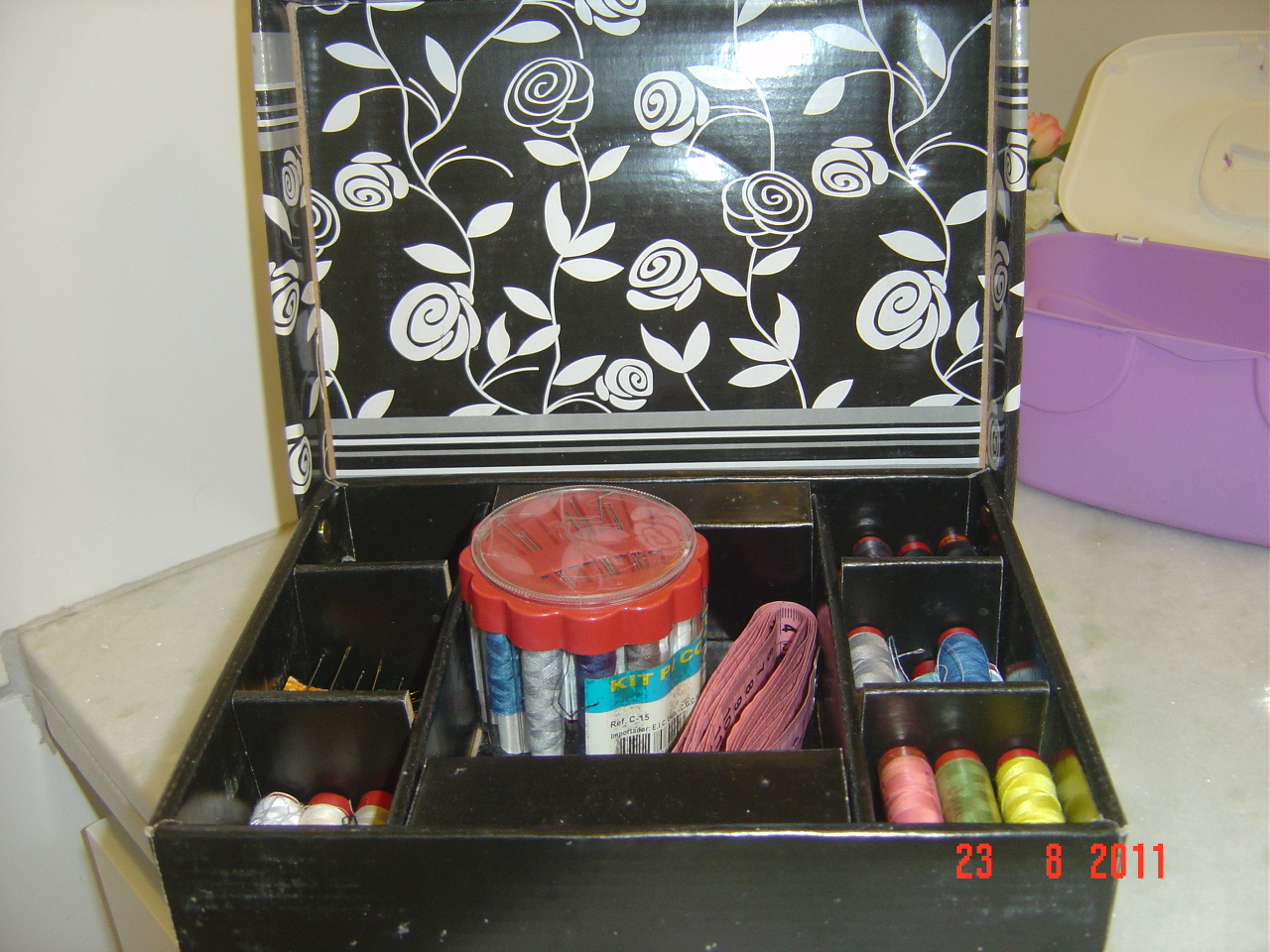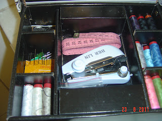Cada compartimento das xícaras, ficou para linhas, agulhas, botões e onde era os pires coube minha maquininha de costura.