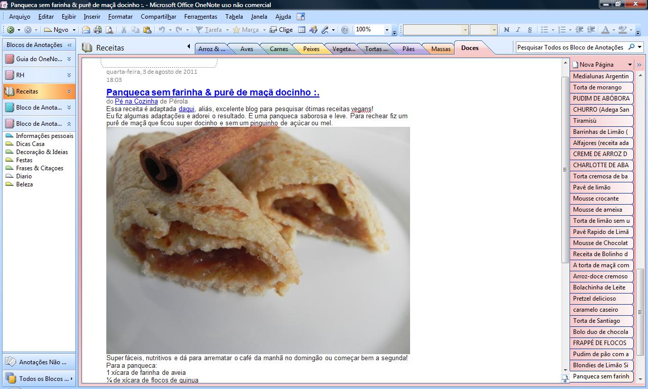 Depois que comecei a usar computador, comecei a colocar as receitas no OneNote do Windows, fica bem organizado, eu separava por categoria, era bem fácil de localizar, mas tinha um inconveniente: só dava para vê-lo no meu computador