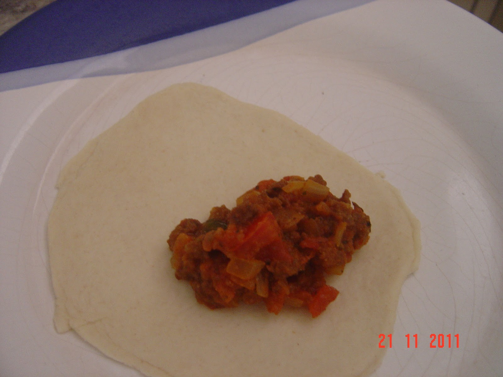 2- Recheie à gosto e feche a massa com um garfo. Meu recheio foi de proteína de soja, parece carne moida com molhinho de tomate caseiro, bem úmido