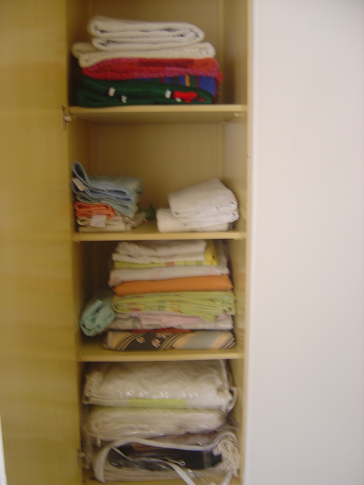 Na terceira prateleira as roupas de cama e em baixo a manta e um edredom.